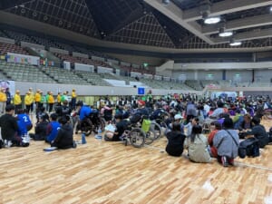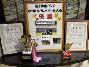先日、北九州市立総合体育館にて開催された「第二回東アジアふうせんバレーボール大会」に、ご利用者4名、職員6名が参加しました。クラス別(Dクラス)にて当施設チームが見事優勝いたしました!