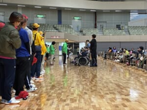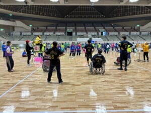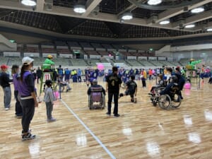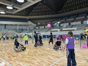 「ふうせんバレーボール」は障害の有無、性別、年齢に関係なく誰でも参加でき、加えて「風船か自コートに入ってから選手全員にパスを回した後に返球する」というルールが設定があるため、全員にプレーの機会があり、チームワークがとても大事なスポーツです。